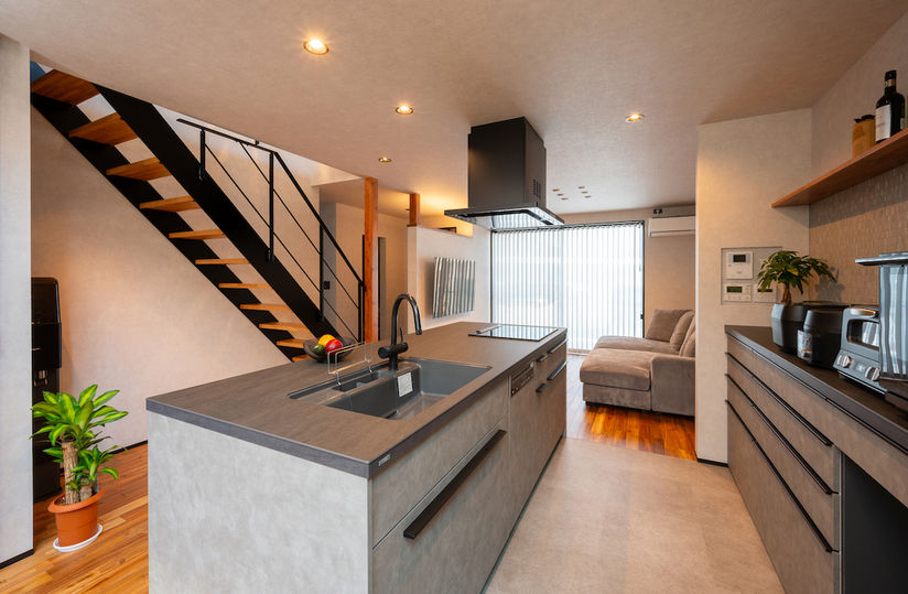 「北側の庭」と「吹き抜け」を活かした開放的な設計。一般的には南側に庭をつくることが多い中、あえて北側に庭を配置。建物を南側に寄せることで、隣家との間に“ズレ”が生まれ、そこから光と風を効率よく取り込めるようになっています。さらに、吹き抜けを取り入れることで、リビングは一層明るく、広がりのある空間に。「明るさ」「プライバシー」「暮らしやすさ」を兼ね備えた、家族が自然と集まる住まいです。
